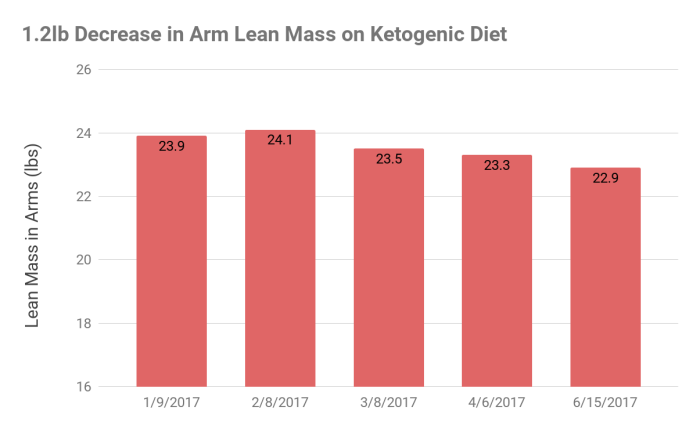 I was jealous. Was breastfeeding giving Jess a superpower to produce ketones? Why did my body prefer to make sugar from protein instead of producing ketones? After thinking it over for a week I decided to cut my protein intake from 161g (1g/lb of lean mass) to 72g starting March 15th, 2017. This amount was 10% above the 65g minimum protein intake for my body size recommended by the World Health Organization using their calculation of 0.36g/lb of total body mass. I had been hesitant to do this before because I was concerned that decreasing my protein intake would result in the loss of lean mass. This change took some recalibration of my diet and was especially tricky when trying to estimate the protein content of uncommon foods such as slow cooked Mangalitsa pork skin with adipose.