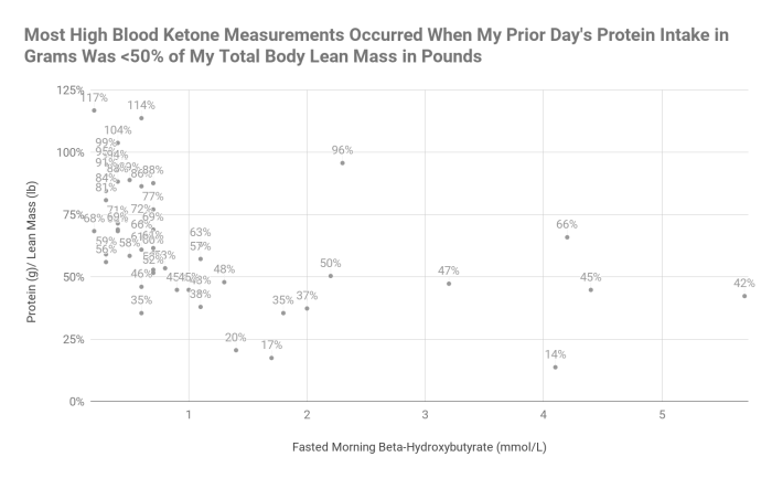 I started off with a day of only 33 grams of protein, mostly by accident because I didn’t tally my food until the end of the day, and I was afraid to eat too much protein. I was rewarded the next day with a fasted morning blood beta-hydroxybutyrate level of 1.4mmol/L. From that point on my levels were consistently above 1mmol and the average for the next two weeks was 1.2mmol/L with my highest reading at 5.7mmol/L!