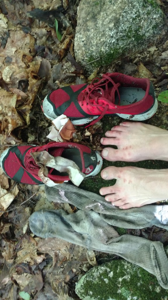 I ducked out of the wind and began taping my knees, better to stay ahead of this pain. I wasn’t hungry or thirsty but I thought it prudent to stay ahead of those things too. I crunched clouds of pork skin with stiff peaks of mayo and then floated down sheets of wet granite. More than once my feet flew down ahead of me. Each time I picked myself back up, grateful for no severe injury. The day rolled on, the trail passed under my feet, the trees returned, as did the rain. My knees were feeling better, but there was a new sensation in my Achilles.
