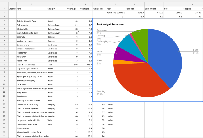 I packed a total of 20,490kcal, weighing 106oz (6.6lbs) including packaging with an average kcal/oz of 194, a combined Wilder ratio of 4.4 and a total cost of $83.85. I could have cut costs with cheaper ingredients, but I opted for high quality fuel.